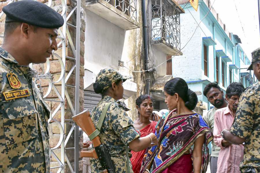 Security personnel keep vigil during voting in the first phase of the West Bengal Assembly elections, at a polling station in Panskura, Purba Medinipur, Thursday, April 23, 2026.