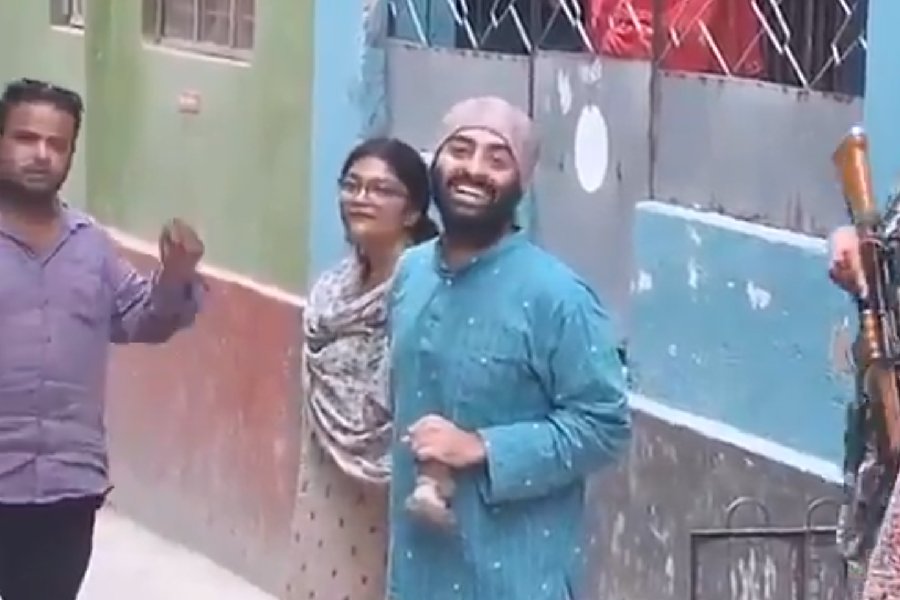 Singer Arijit Singh leaves the polling booth with his wife after casting his vote on Thursday in Jiaganj, Murshidabad, West Bengal.