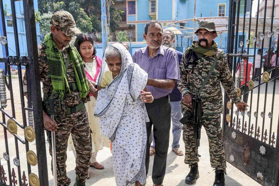 Security personnel assist an elderly woman during voting in the first phase of the West Bengal Assembly elections, at a polling station in Bolpur, Birbhum, Thursday, April 23, 2026.