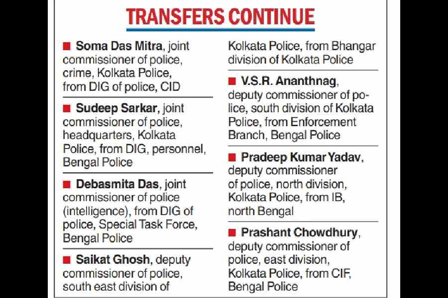 According to the order, V.S.R. Ananthnag from the Enforcement Branch has been posted as deputy commissioner of police of the south division of Kolkata Police, while Pradeep Kumar Yadav from the Intelligence Branch in north Bengal has been appointed deputy commissioner of the north division.