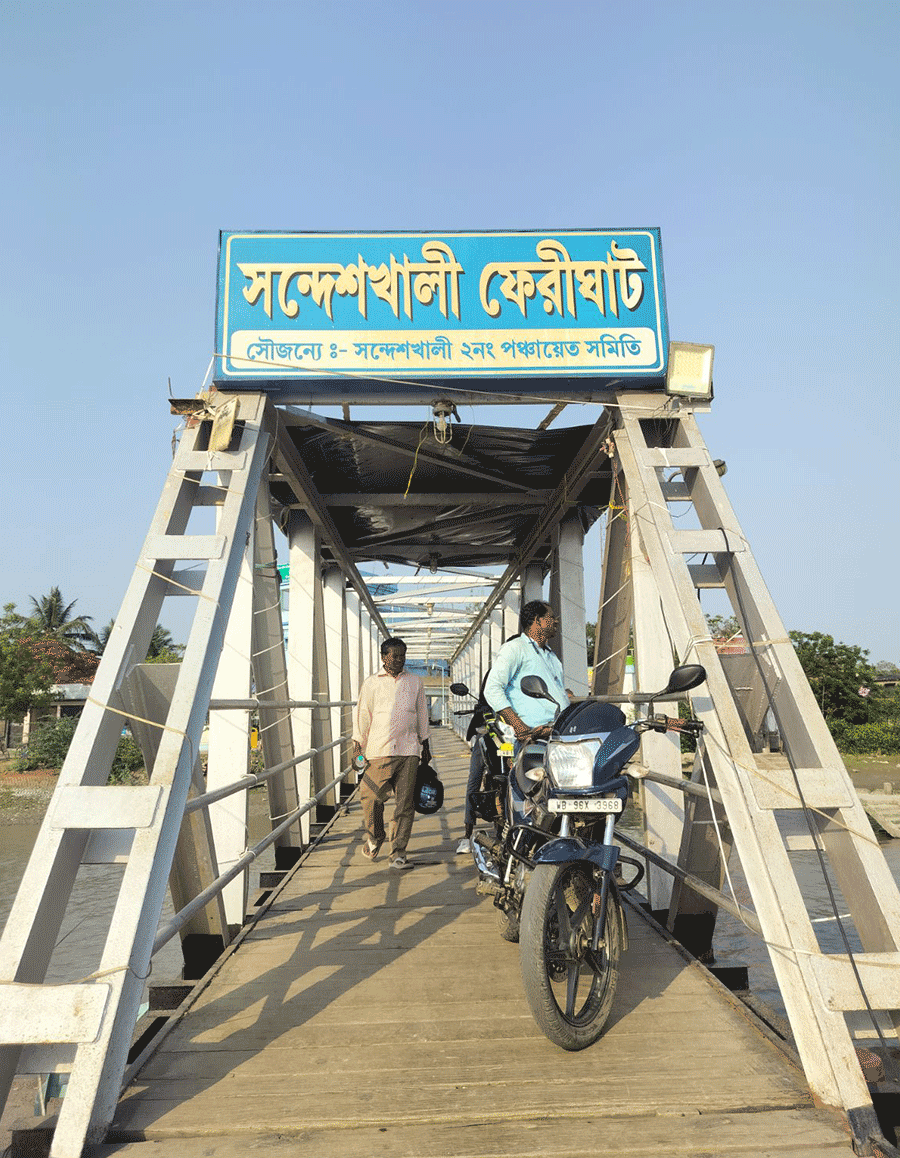 People cross the Sandeshkhali ferry ghat bridge.