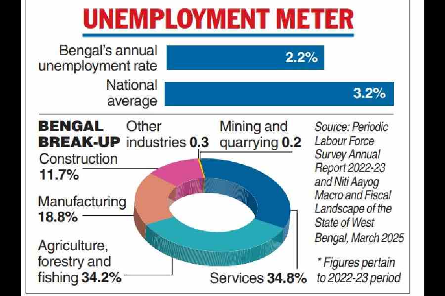 The Macro and Fiscal Landscape of the State of West Bengal, a report prepared by the Niti Aayog in March 2025, says that the “annual Unemployment Rate for the State at 2.2 per cent in 2022-23 is below the national average of 3.2 per cent”.