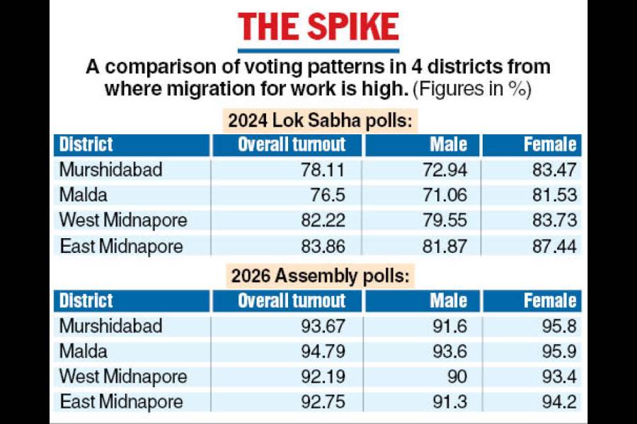 In Murshidabad, the turnout among male voters skyrocketed from 72.94 per cent in the 2024 general election to 91.6 per cent on Thursday — a rise of 18.66 percentage points, data from the Sabar Institute, a research organisation, show.