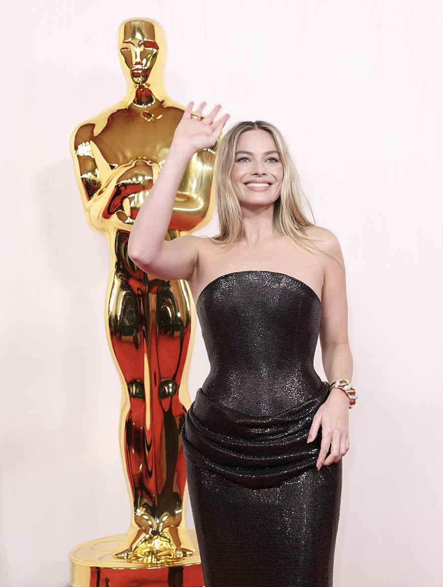 The Barbie star dazzled in a black strapless Versace dress and wore her elegant smile for the cameras.