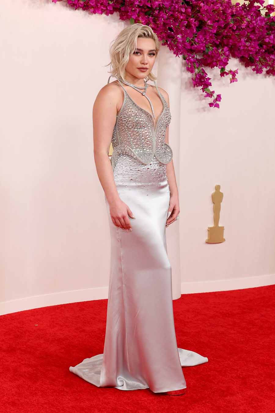 Florence Pugh too sported a gown with a floating shoulder strap. The silver number from the Del Core SS2 RTW collection was glammed up by her wet look and Bulgari necklace.
