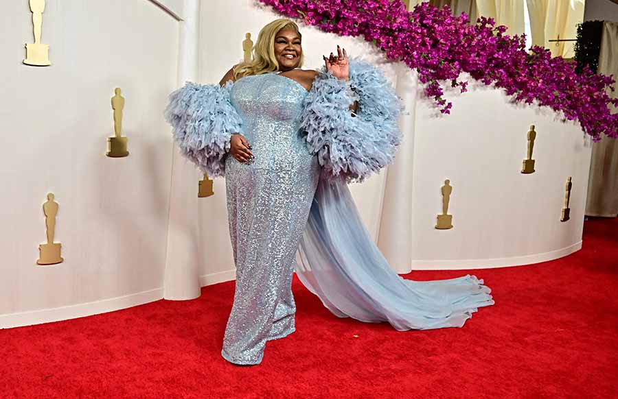 The Holdovers actress Da’Vine Joy Randolph was all set to lift the best supporting actress trophy in a powder blue shimmery gown with feather pom pom sleeves and a trail.