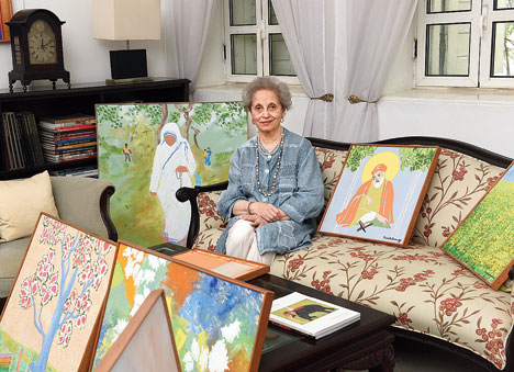It is a selection of works. There’ll be flowers, landscapes… there is one with an avenue of trees. When I was driving with my family in Kashmir, there is an avenue with chinars… I can never forget that sight. I haven’t done the exact chinars though. There is Mother Teresa of course… she with kids, praying… her room… I drew whatever came to my mind about Mother that moment…. Mother’s room used to be above the kitchen and it was the hottest room with no fan. There are images of Mother praying too. Then there’s the Maidan, a sunset from the aircraft, the yellow gulmohar, mustard fields, a tea garden, a train to Darjeeling....