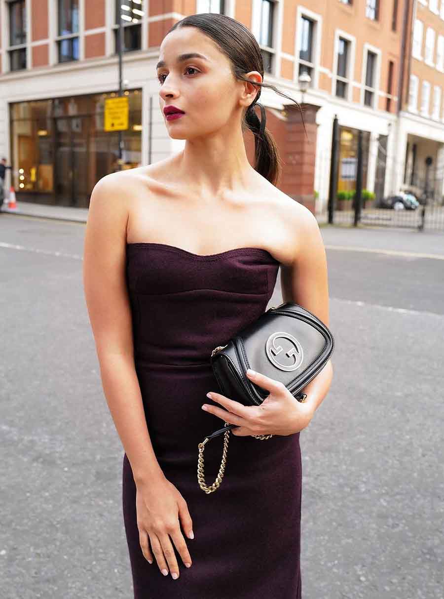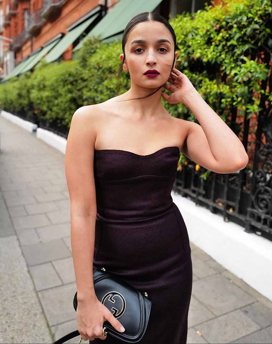Flaunting her Gucci handbag, Alia went for vibrant maroon lipstick to go with her dewy makeup.