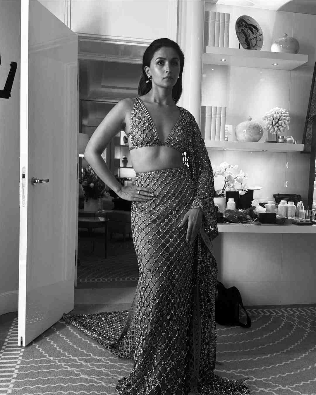 At the closing ceremony of Cannes International Film Festival 2025, Alia wore a nude-coloured sequinned sari-like drape from the house of Gucci, styled by Rhea Kapoor.