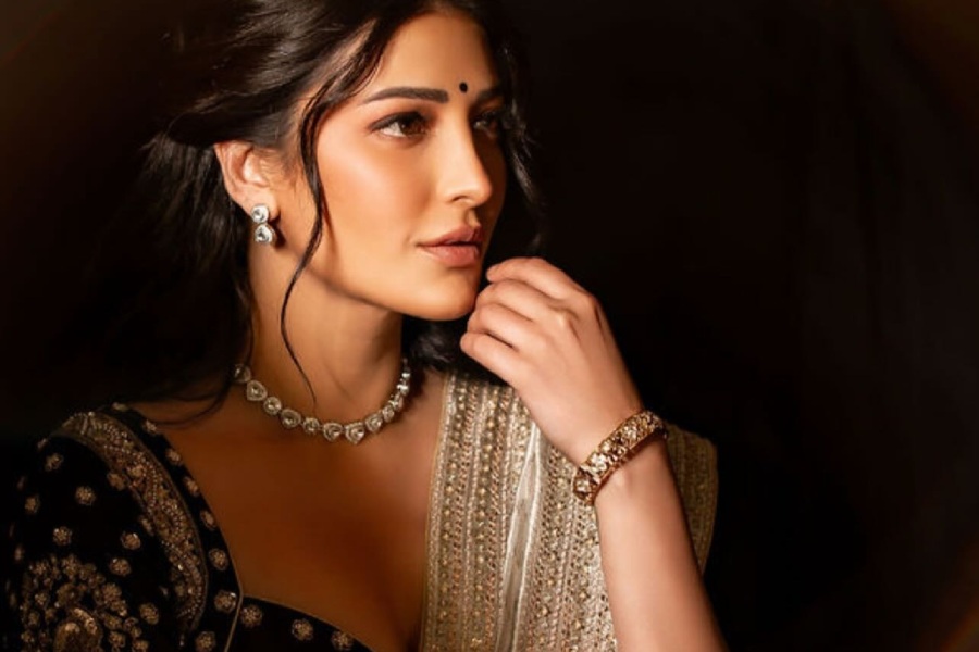 Shruti Haasan added vintage glam to the Diwali mood with her luxurious silver saree paired with a black blouse featuring polka dots and an open back.