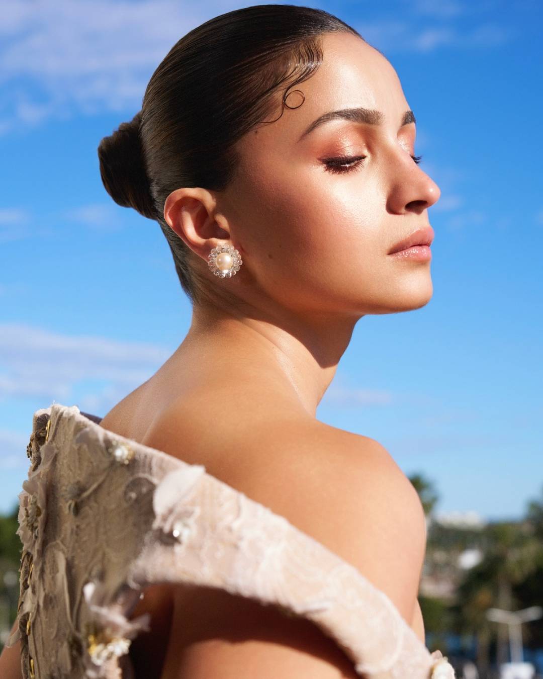 Alia went for a natural makeup look with glossy nude lips and dewy peach blush on the cheeks. She styled her hair in a sleek bun and accessorised her look with peach stud earrings that complemented her outfit.