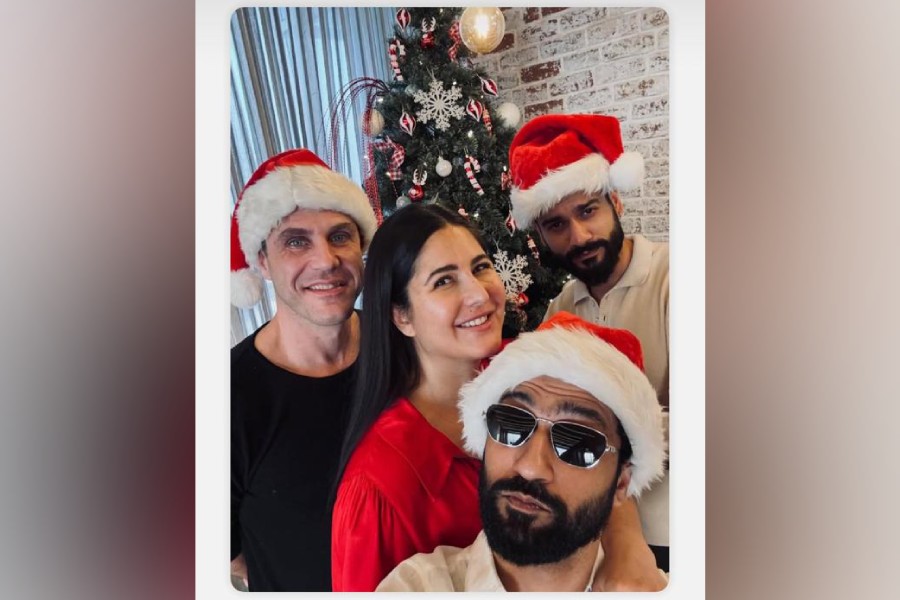 New parents Vicky Kaushal and Katrina Kaif posed for a selfie with Vicky’s brother Sunny Kaushal in front of their Christmas tree.