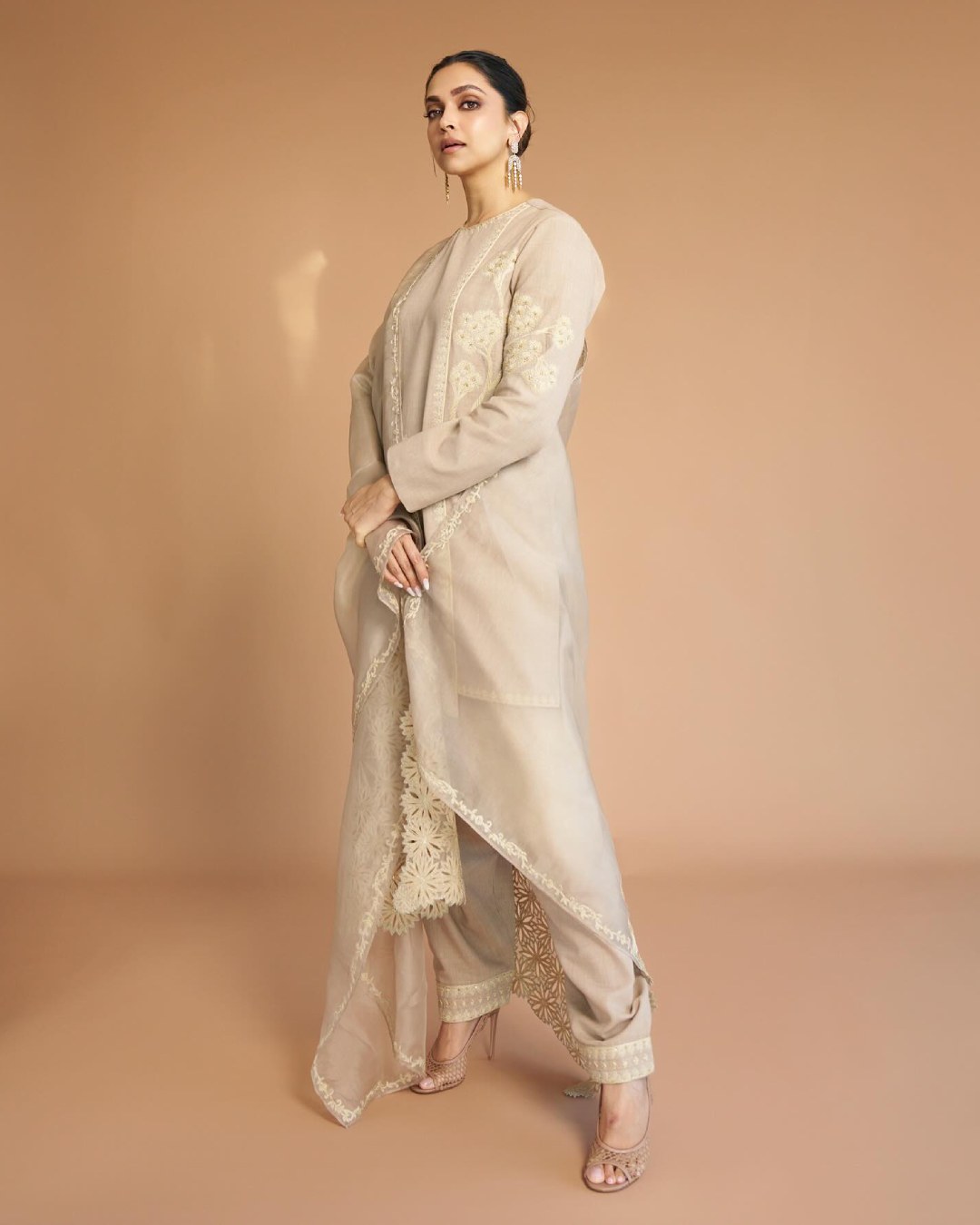 Deepika stunned in a beige salwar suit from Masaba Gupta’s new collection. She completed her look with a neatly-tied bun, dewy makeup and statement earrings. “En route… @wavesummitindia! Let’s do this,” the 39-year-old actress wrote alongside the photos.