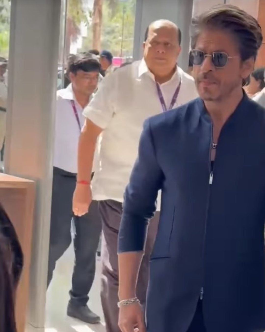 Shah Rukh looked dapper in a deep blue blazer and trousers. Black shades and slicked back hair complemented his look for the day.