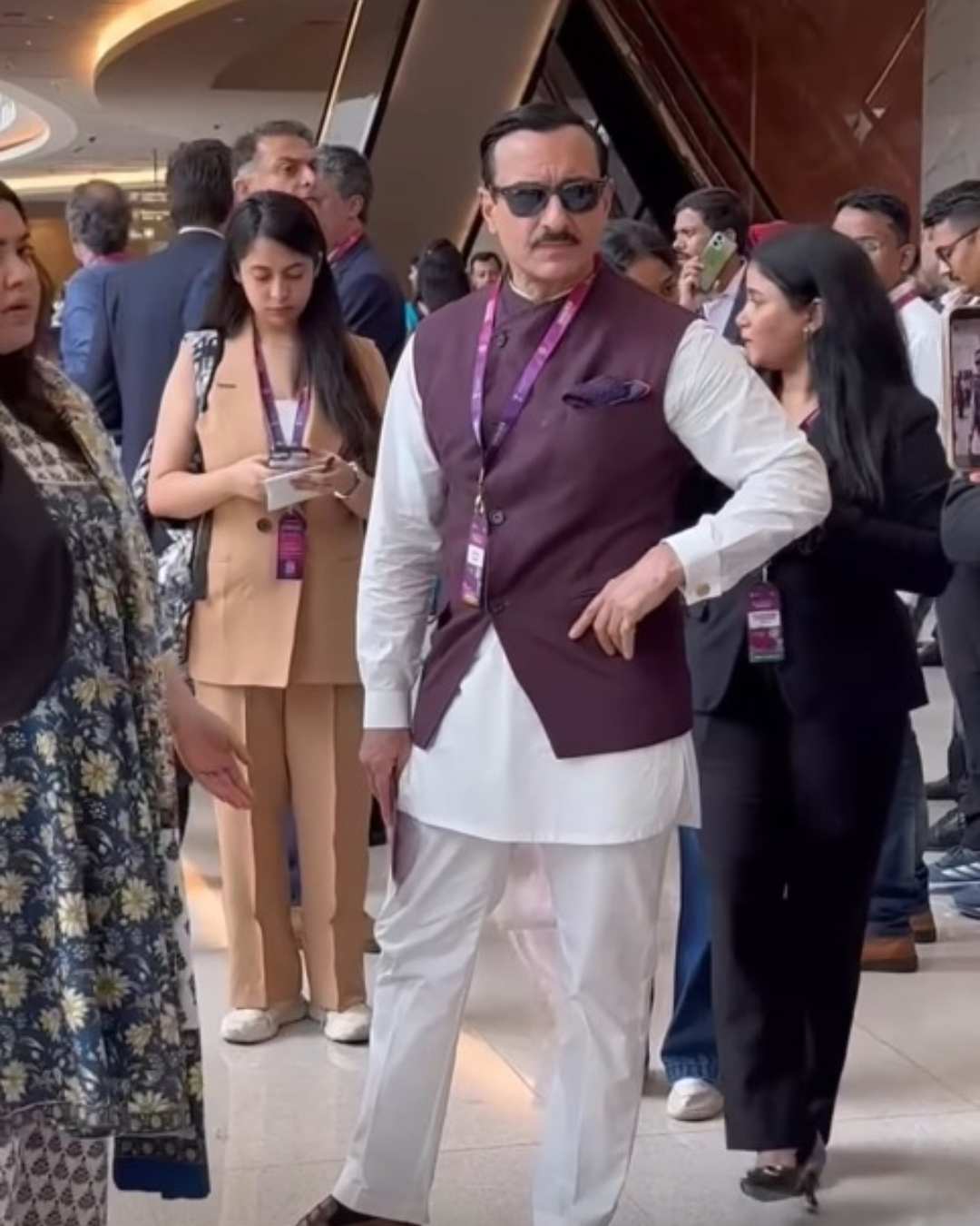 Saif posed for the lens in a maroon-coloured Nehru coat over a white kurta and pants.