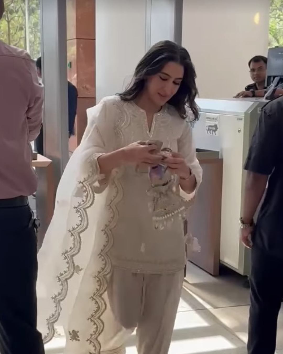 Sara Ali Khan exuded charm in a white embroidered salwar suit. She kept her wavy tresses open and opted for a no-makeup look.