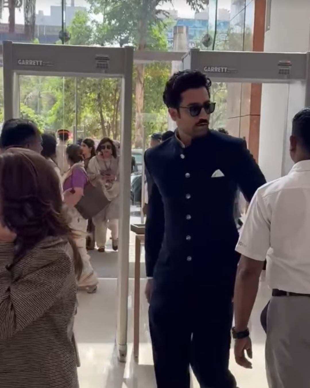 A navy blue Indo-western sherwani set paired with black sunglasses was Vicky Kaushal’s choice for the summit.