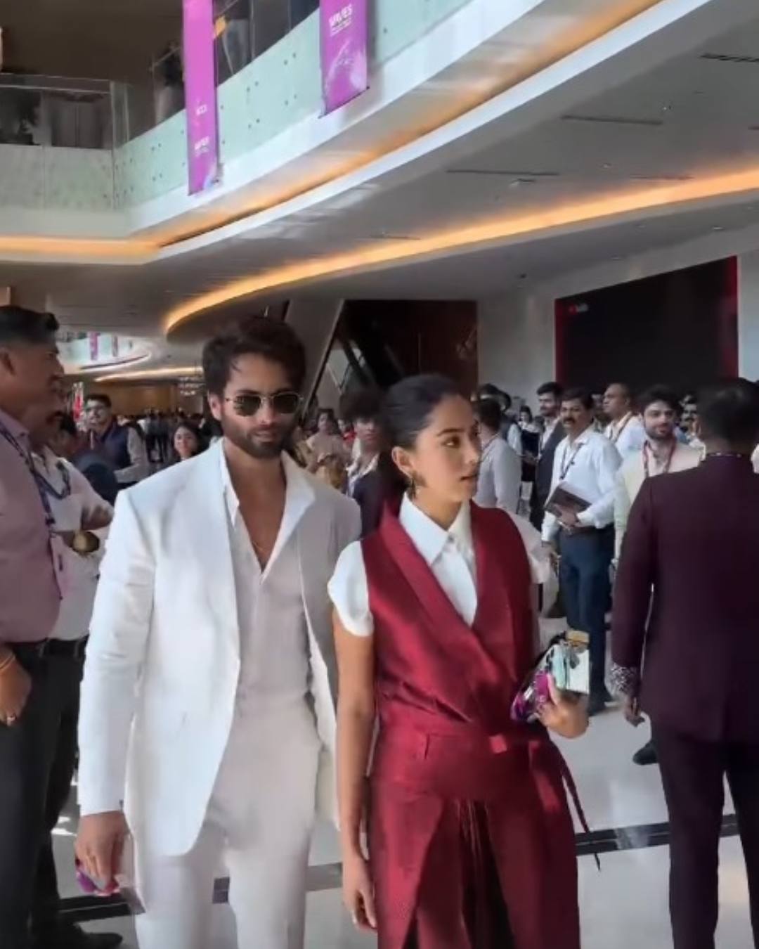 Shahid Kapoor put his best fashion foot forward in a white suit. The actor’s wife, Mira Kapoor, offered a striking contrast to his spic-and-span ensemble in a maroon co-ord.