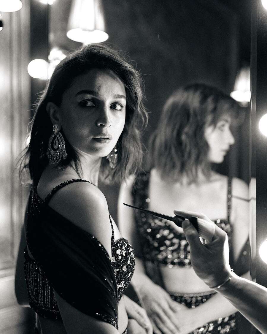 Alia went with her go-to hairstyle — shoulder-length bob with brown highlights — to complement her look. The 31-year-old actress also opted for stone-studded danglers and a finger ring to accessorise her look.