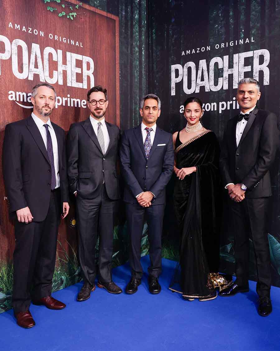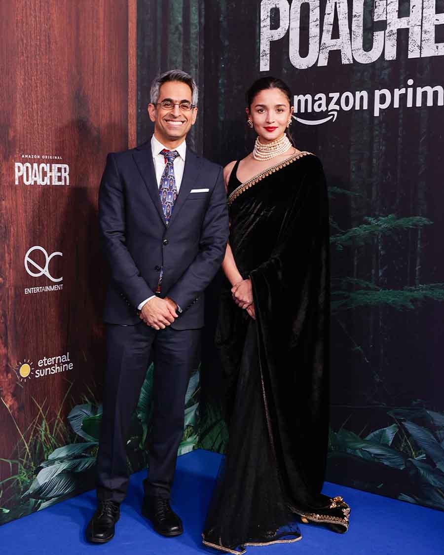 Alia Bhatt sported a black Sabyasachi sari at the special screening of the upcoming Amazon Original crime series Poacher in London on Sunday. Here’s a look at some of her moments from the event, also attended by her family and the cast and crew of the series.