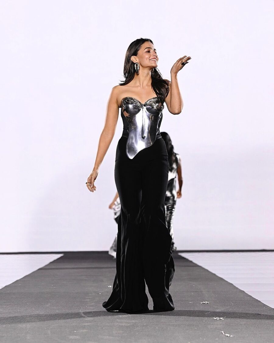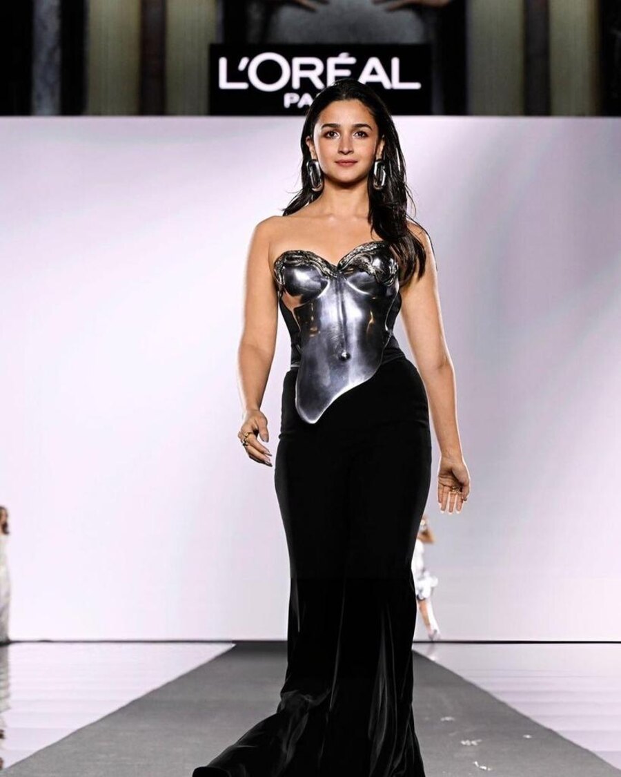 Actress-producer Alia Bhatt on Monday stunned in a metallic corset designed by couturier Gaurav Gupta at this year’s Paris Fashion Week. She was accompanied by American actress Andie MacDowell during the show for French cosmetics giant L’Oréal Paris. Here’s a look at some of her photos from the event.
