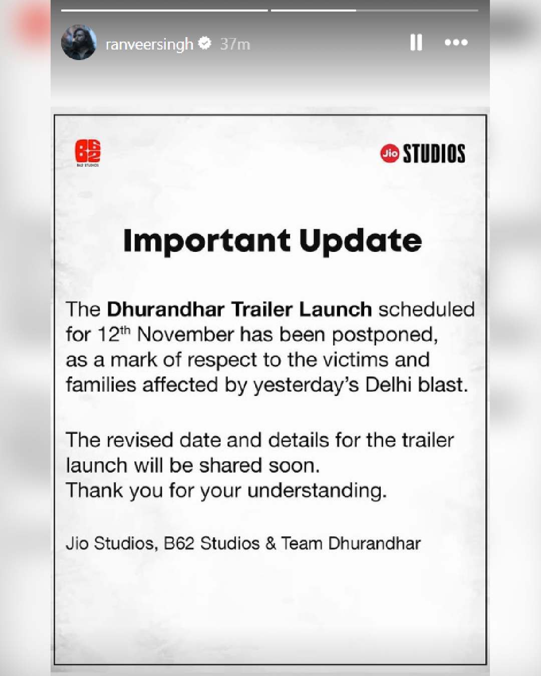 He also shared that the trailer launch of his upcoming film Dhurandhar scheduled to take place on 12 November in Mumbai has been postponed as a ‘mark of respect to the victims and families affected by the Delhi blast’.