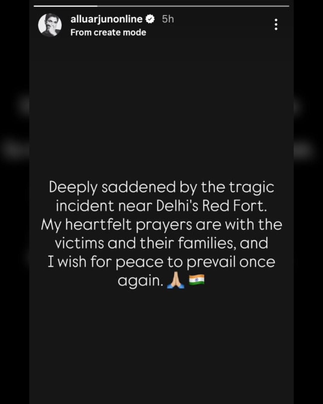 Allu prayed for peace to return soon. “Deeply saddened by the tragic incident near Delhi's Red Fort. My heartfelt prayers are with the victims and their families, and I wish for peace to prevail once again,” the Pushpa actor wrote.