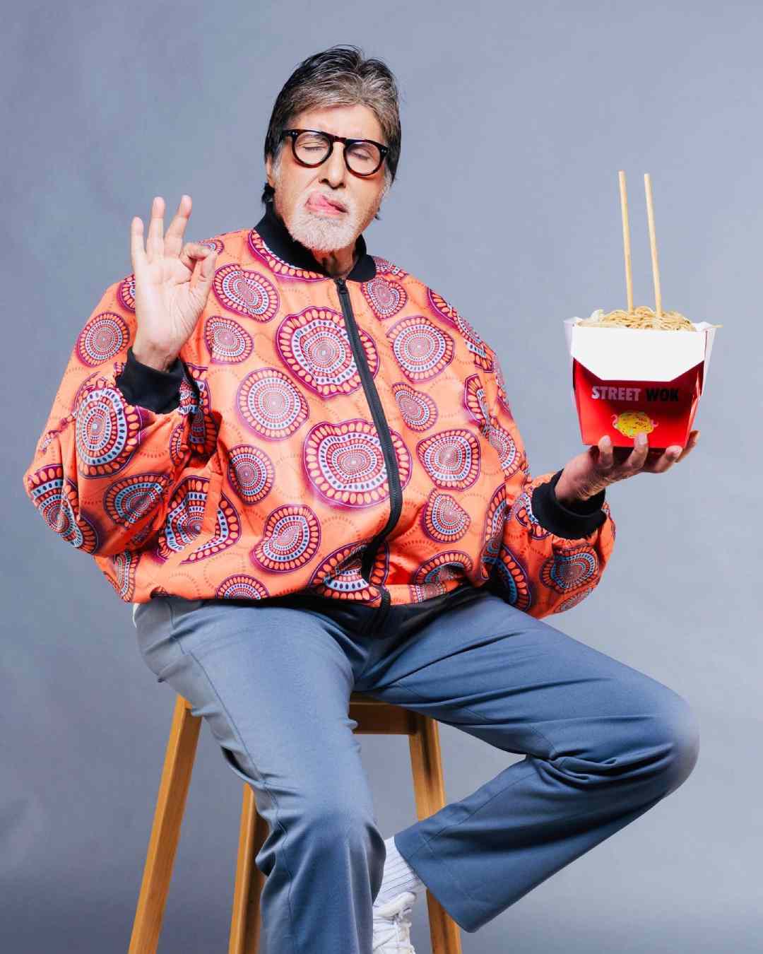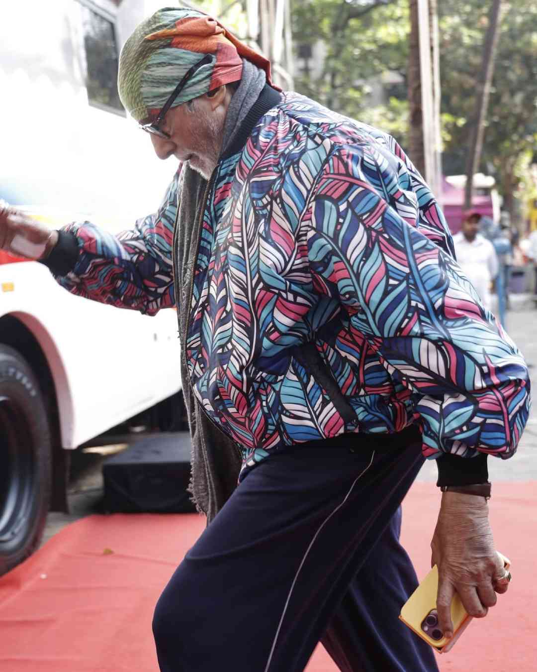 You can never have too many bomber jackets, and Bachchan proves that point quite effortlessly. In another street-style moment, he sported a feather-patterned jacket paired with black track pants. The look was perfectly complemented by a multicoloured bandana that matched the jacket’s design. Black-framed glasses and a grey scarf added the finishing touches.
