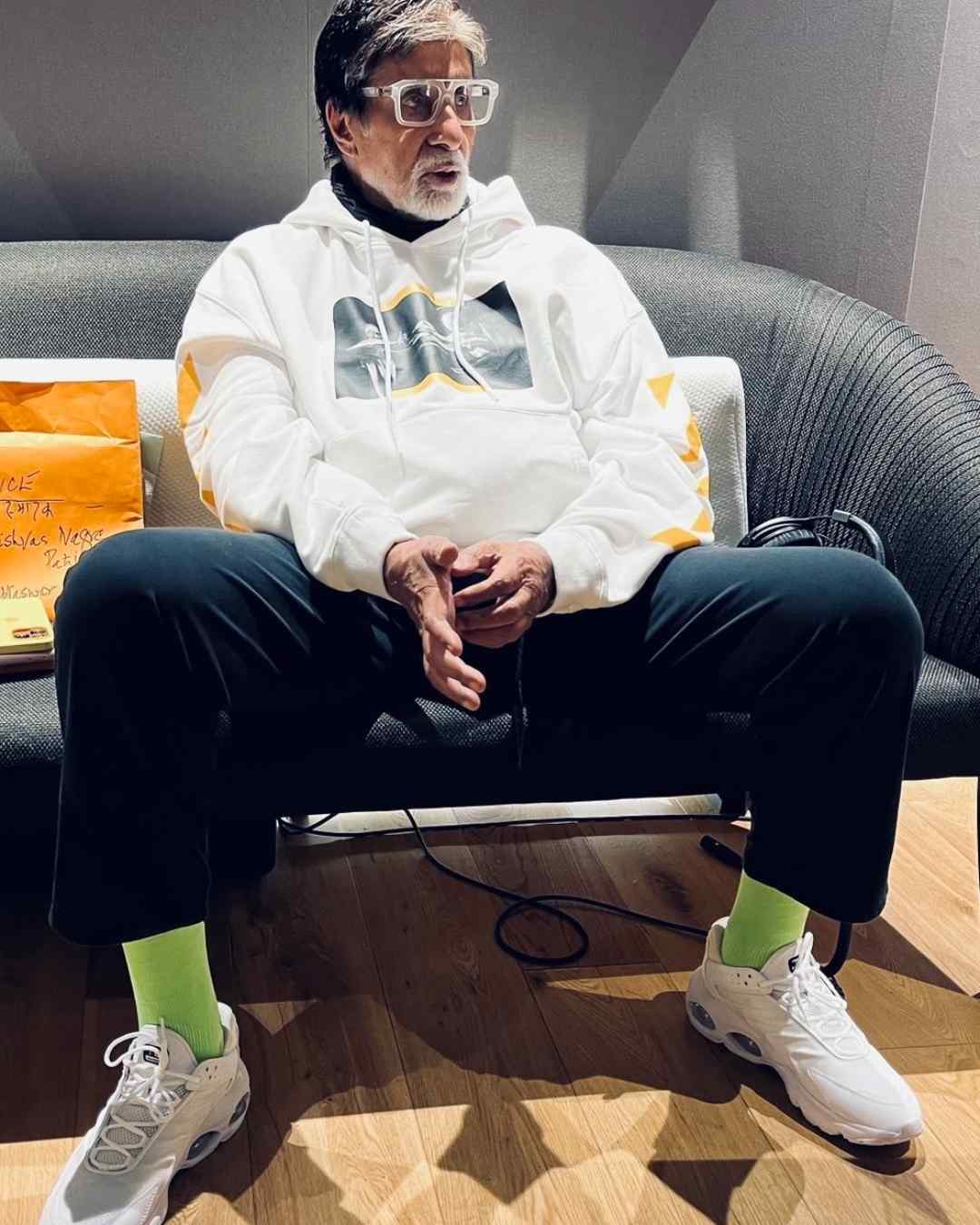 Big B also knows how to keep it casual. Take a look at his laid-back white hoodie and black pants combo, styled with green socks, white sneakers and clear-rimmed glasses. It’s simple, modern and the vibes are definitely cool.
