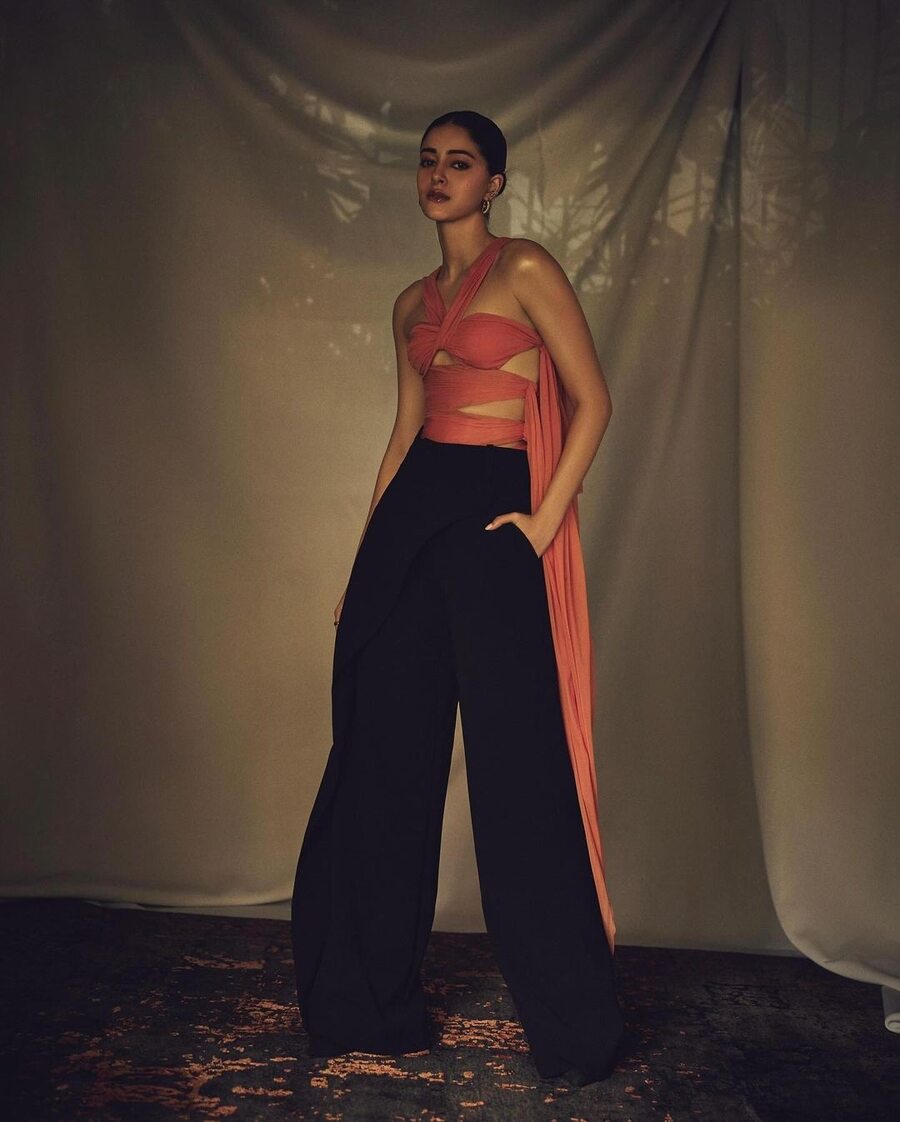 Ananya paired an orange wrap top with black trousers in keeping with her personal style from the series. She styled her hair in a bun and opted for golden hoops to complete the look.
