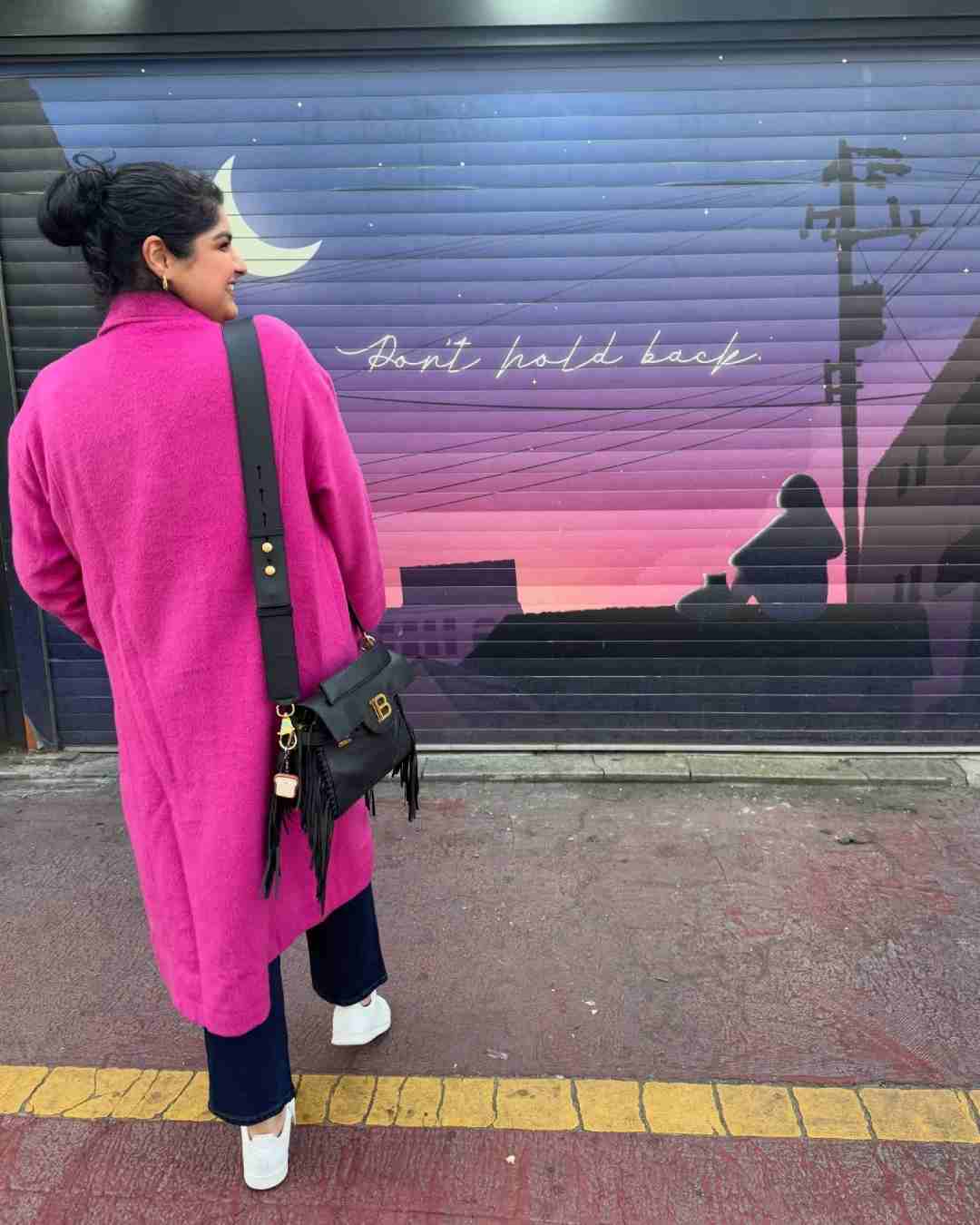 Another photo shows Anshula from the back, sporting a pink coat.