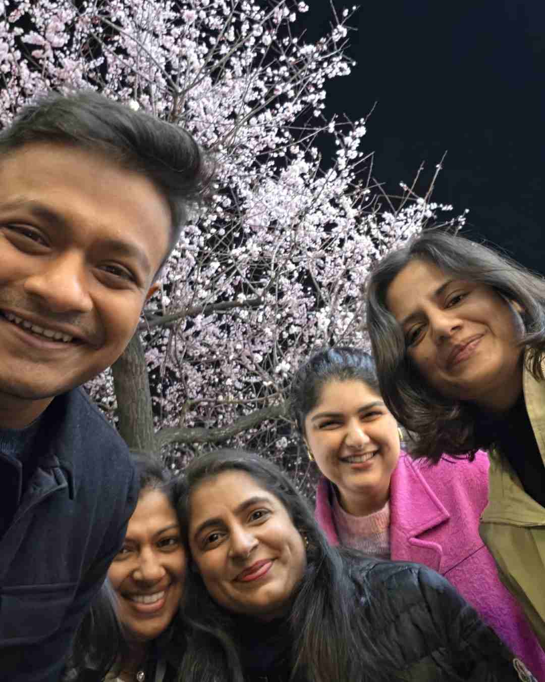 She posed with her friends for a selfie with a cherry blossom tree in the background.