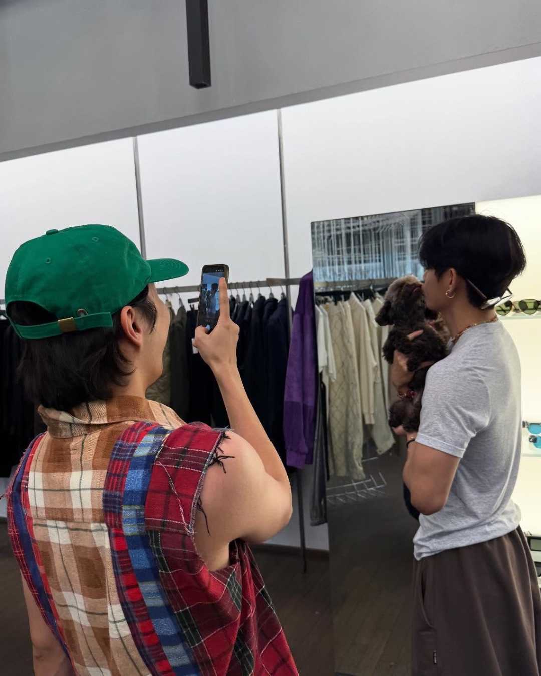 Kim Taehyung aka V went out shopping with his bandmates in between practice sessions. In one of the pictures, V posed with a pet dog at a store while J-Hope clicked a picture of the two.
