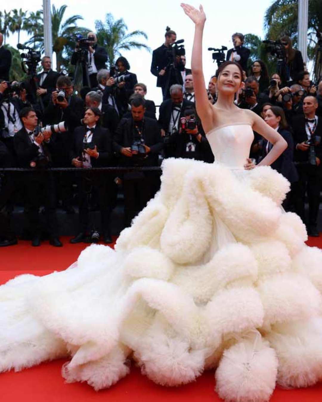 Chinese actor Wan QianHui showed up in a massive white sleeveless gown with a cloud-like body and a long sweeping train. The organisers had clearly prohibited attendees from wearing voluminous outfits with a floor-sweeping train that “hinder the proper flow of traffic of guests and complicate seating in the theatre”.