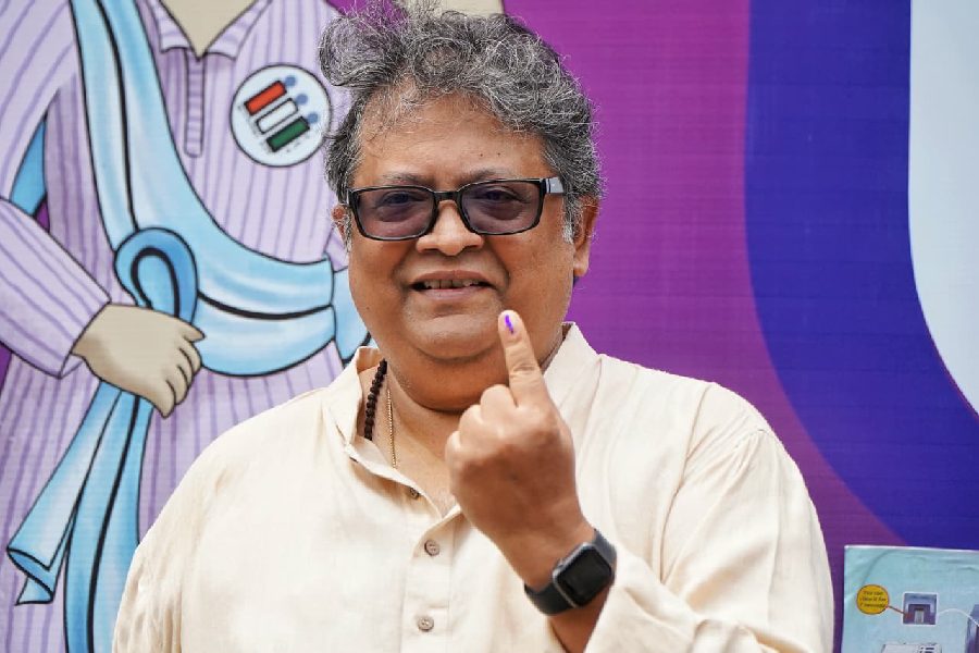 Aniruddha Roy Chowdhury flaunted his inked finger in front of his polling station.