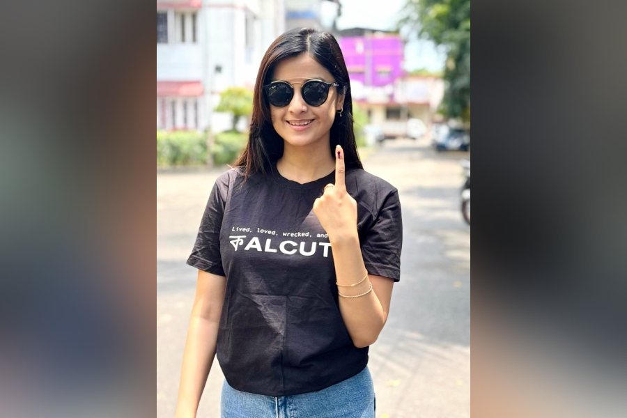Darshana Banik opted for a black T-shirt with text “Kolkata” written across it and paired it with blue denims, as she stepped out to cast her vote.