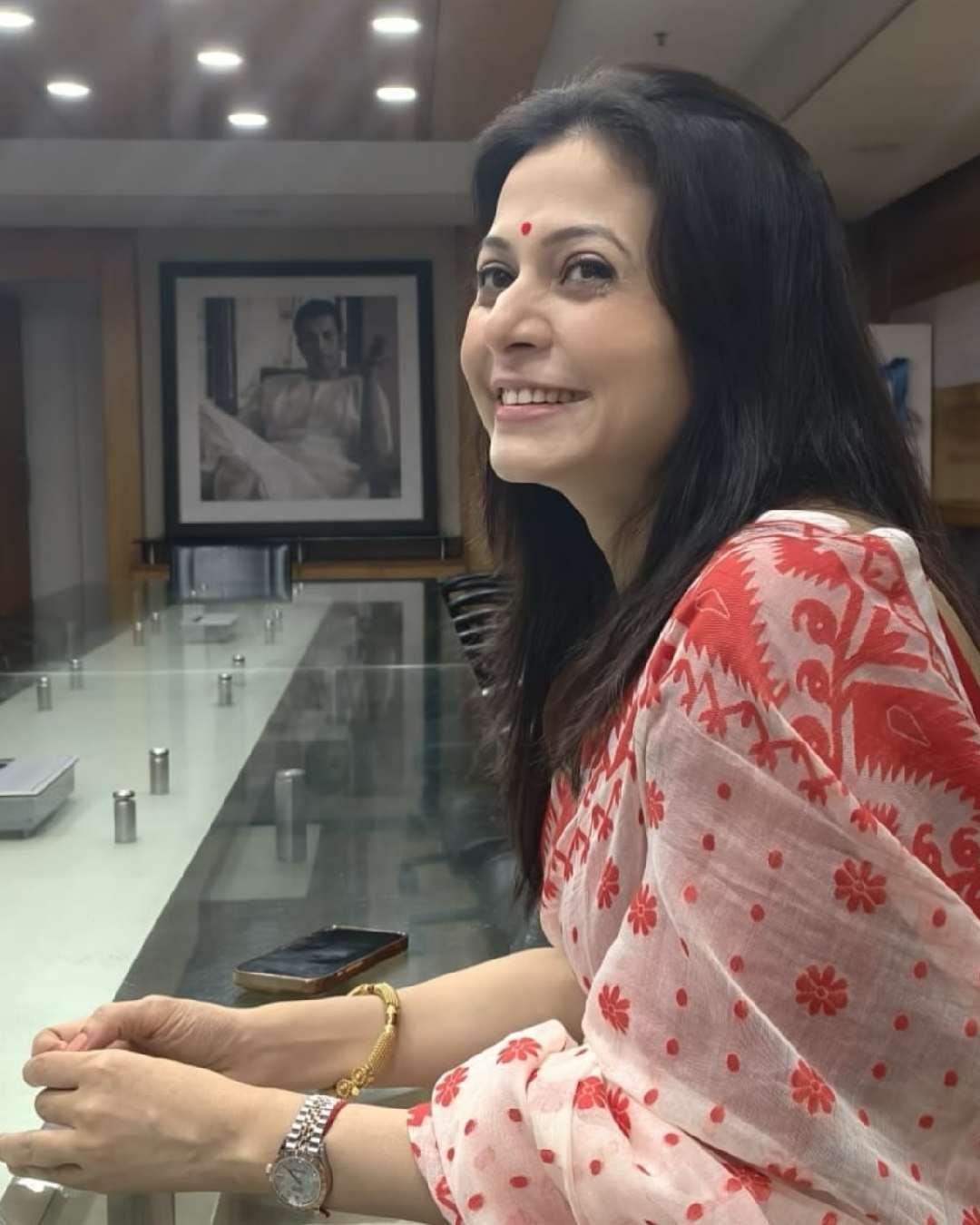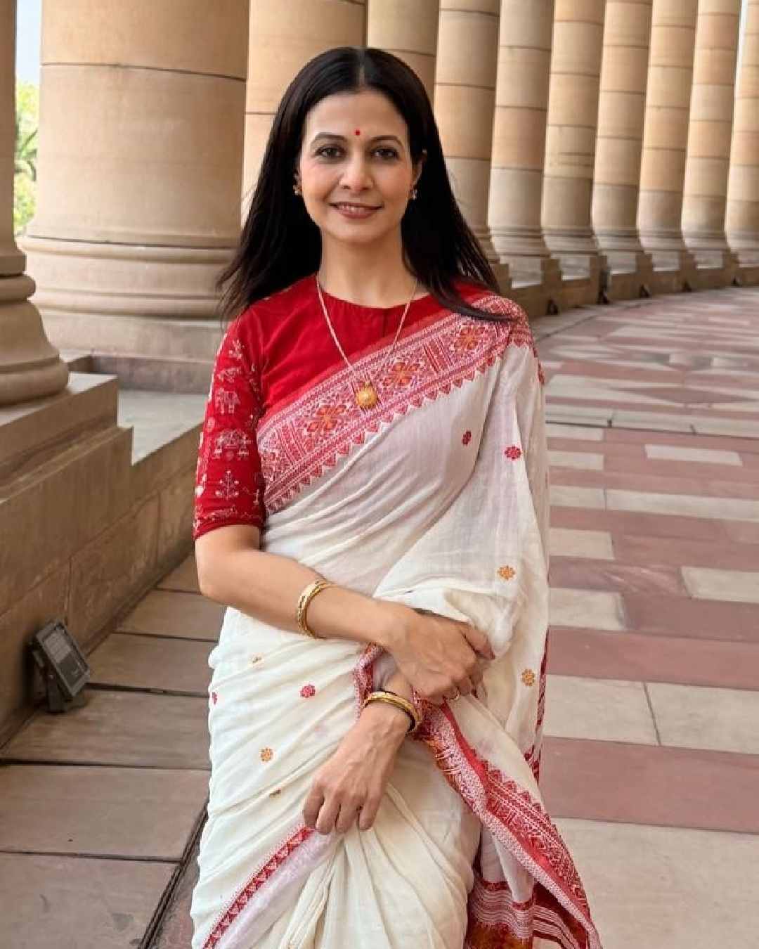 For the oath ceremony, Koel opted for a traditional white saree with a red border. Minimalist makeup, light gold accessories, and a red bindi rounded off her look.