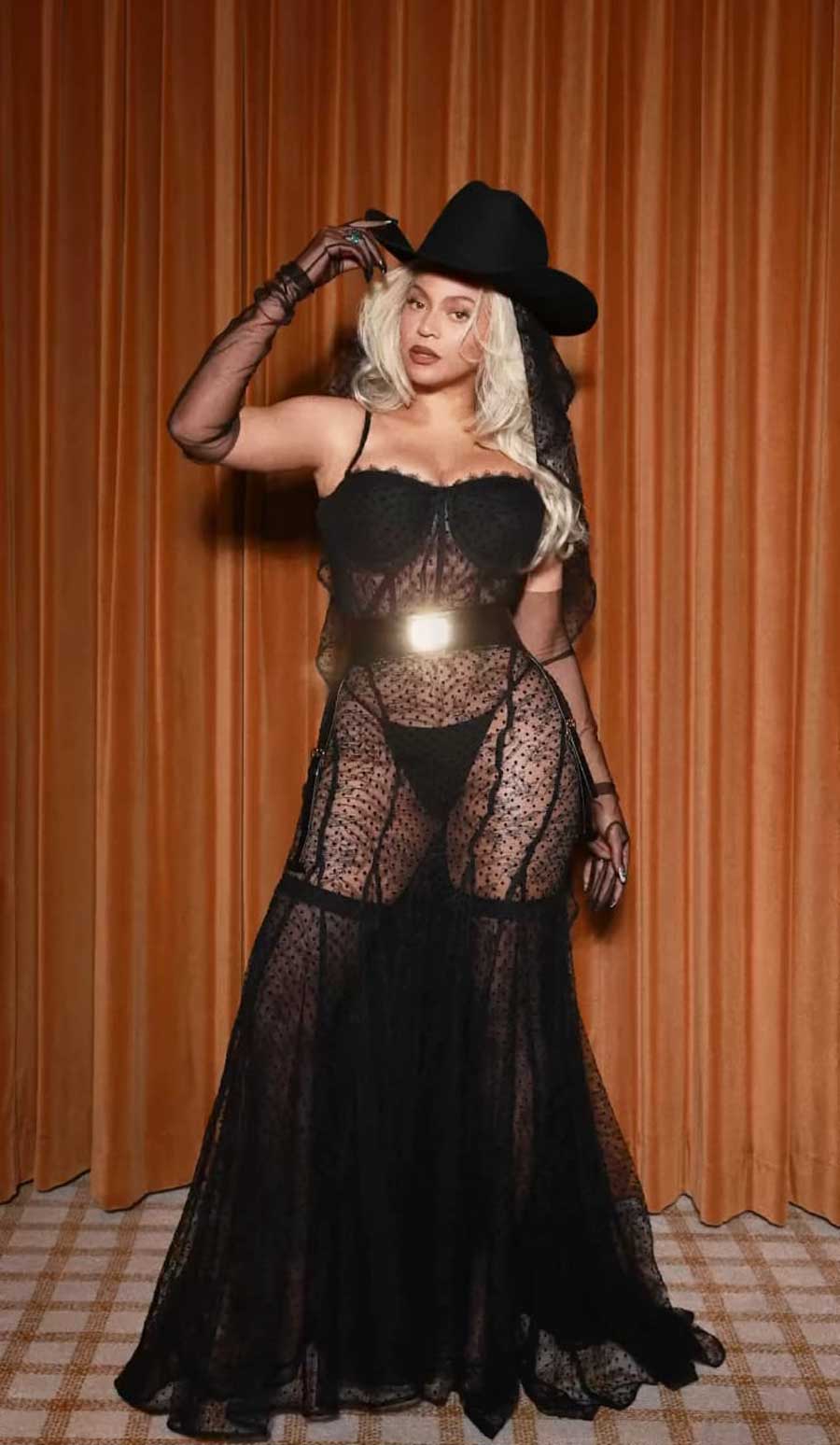 Beyonce rocked a black see-through lace corset dress accentuated with a metallic belt, a black cowboy hat, a matching veil and lace gloves.