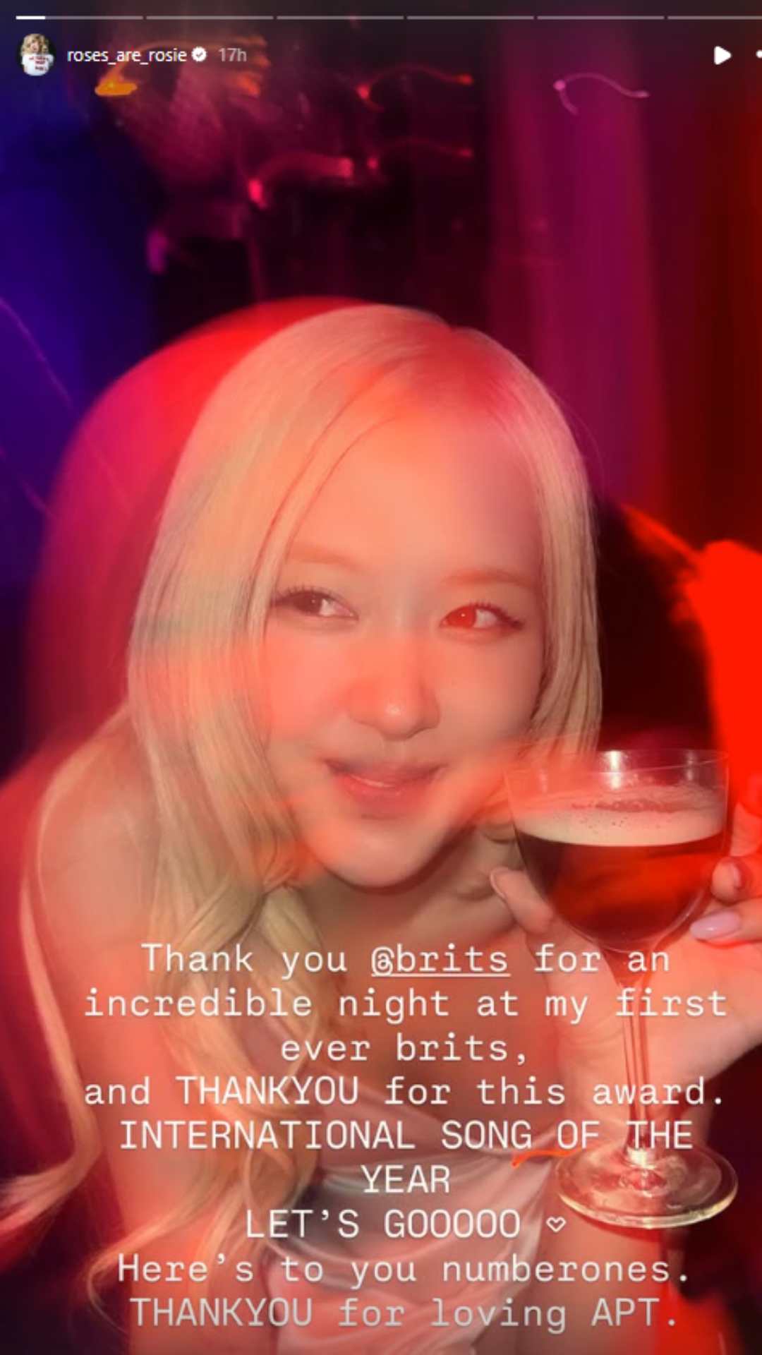 On her Instagram handle, the 29-year-old singer also thanked the organisers of Brit and her fans in a heartfelt note. “Thank you @brits for an incredible night at my first ever Brits, and thank you for this award. International Song of the Year. Let’s gooooo. Here's to you numberones. THANKYOU for loving APT.”