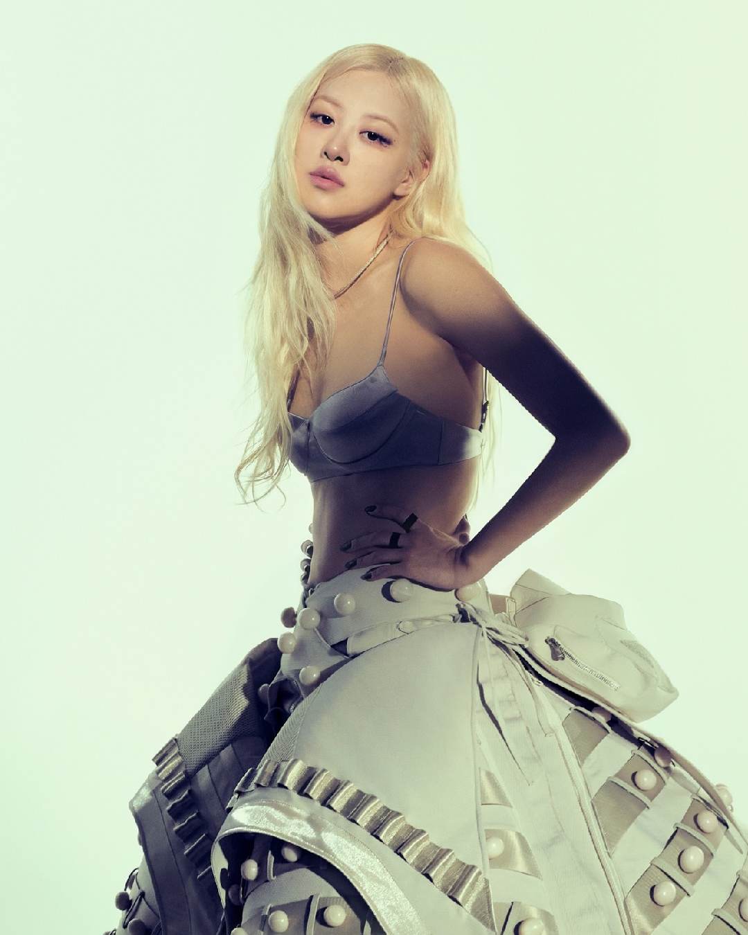Grammy-nominated singer Rose dazzled in a light grey, underwire bralette top paired with a voluminous, sculptural, light grey skirt.