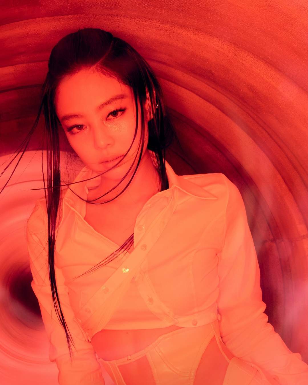 For her second look, Jennie wore a long-sleeved, collared shirt that was cropped above the waist.
