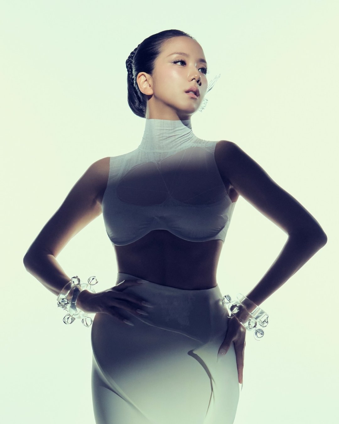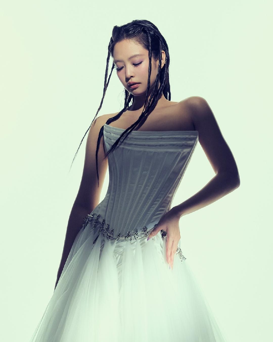 Jennie looked ethereal in the concept poster in a strapless white dress with a structured, corset-style bodice. Her dark hair is styled in long, thin braids or twists that frame her face and fall over her shoulders.