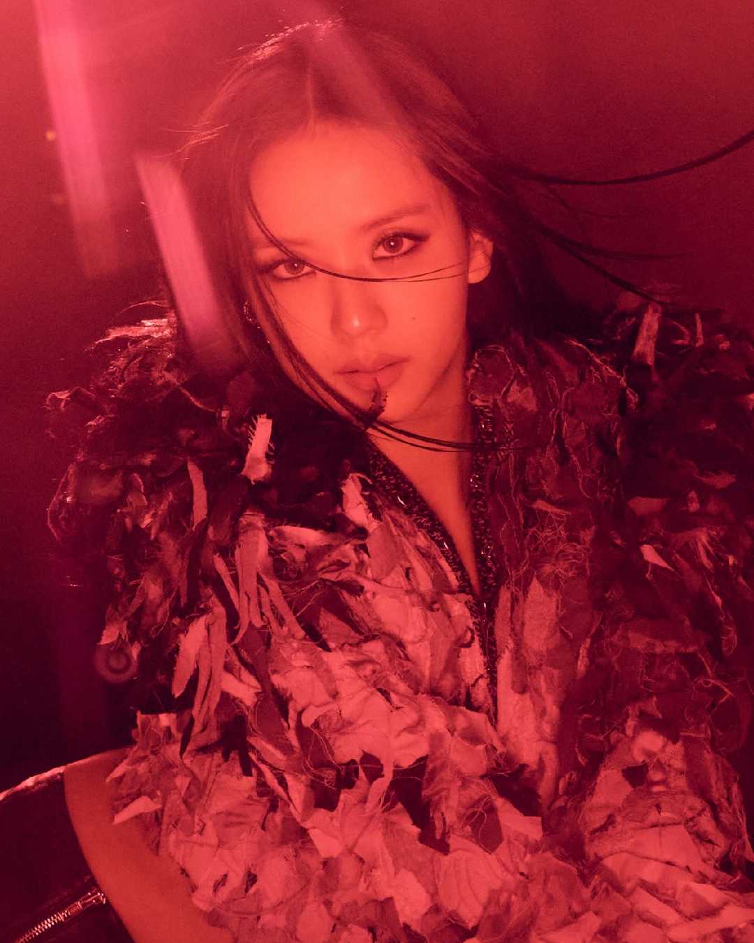 For the Red Light theme, Jisoo opted for a jacket with layers of feathers in shades of red, black, and grey. The outfit has a high neckline and a zipper detail.
