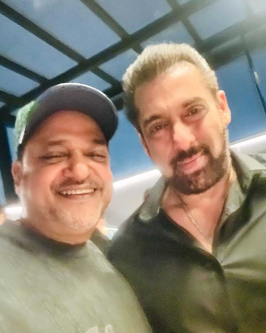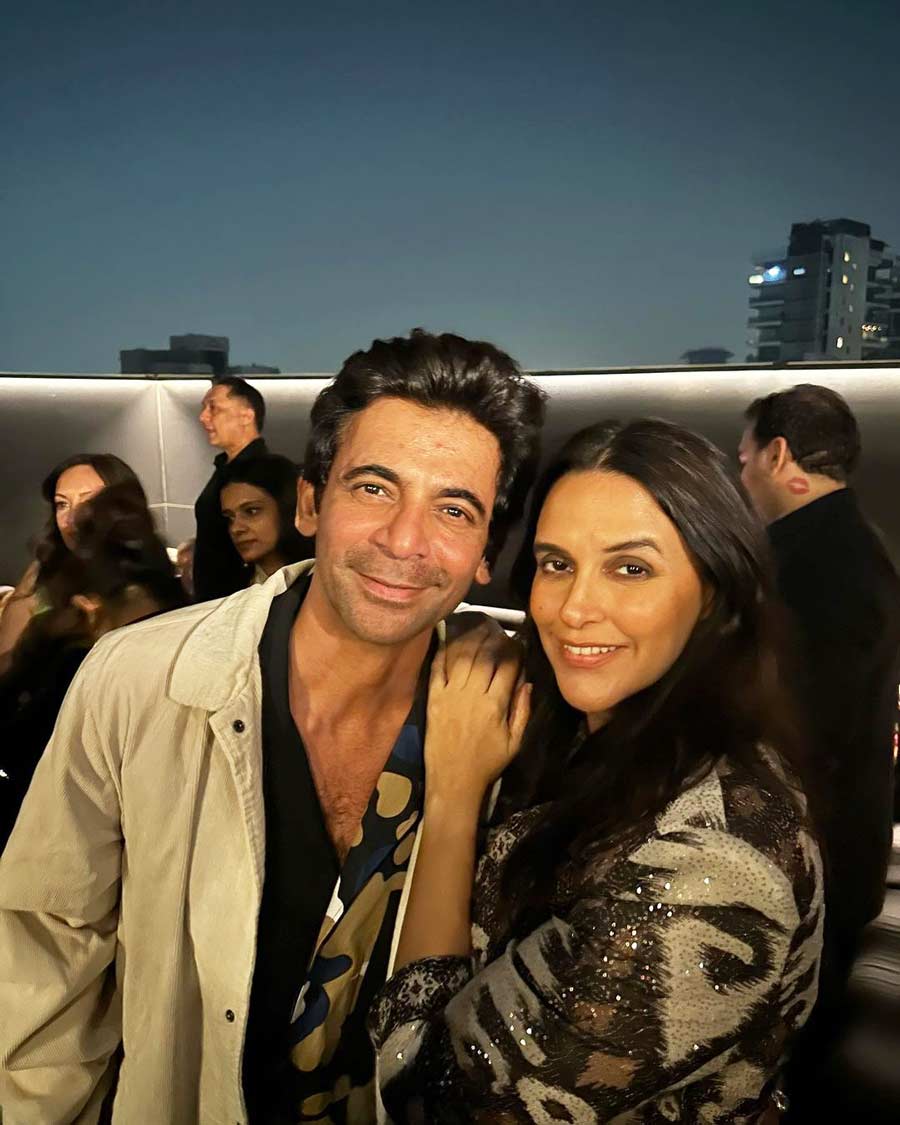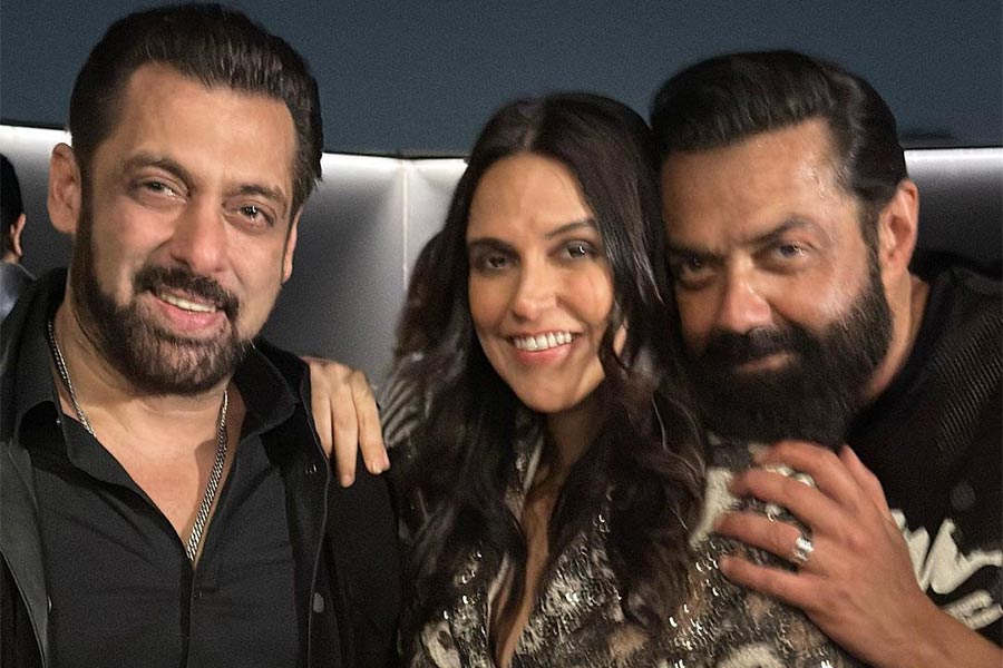 Neha Dhupia, looking gorgeous in a Ranna Gill-designed grey-and-white pantsuit, posed for a picture with Salman and Animal actor Bobby Deol.