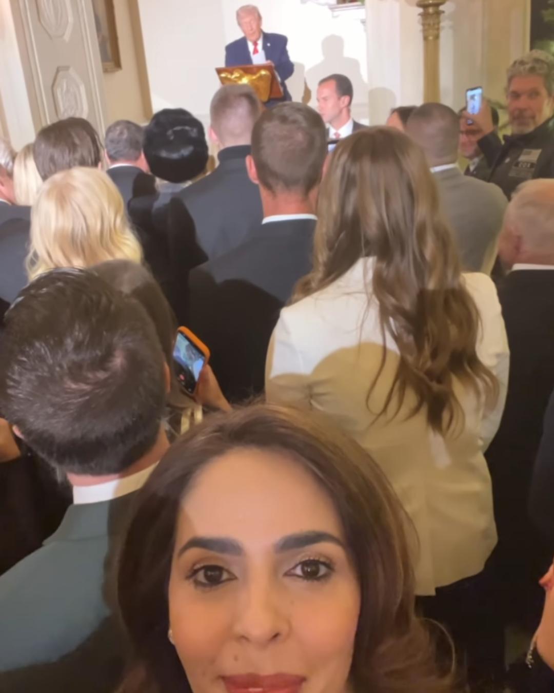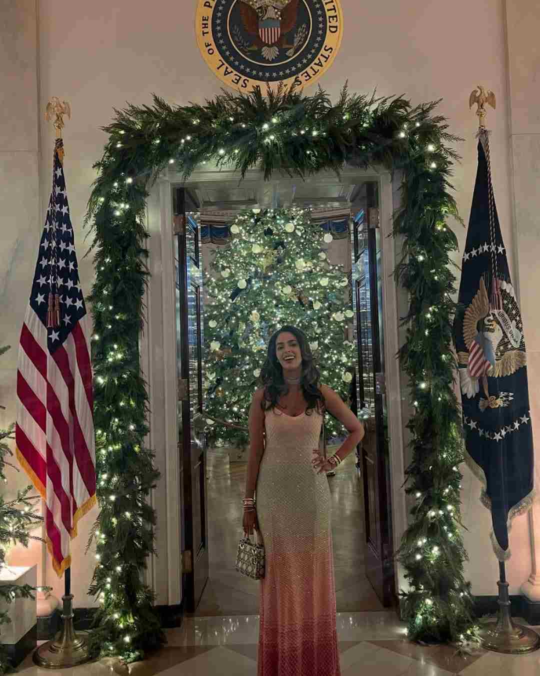 Bollywood actress-model Mallika Sherawat recently attended the White House Christmas dinner, hosted by US President Donald Trump. The actress has shared glimpses from the event on social media. Here’s a look.