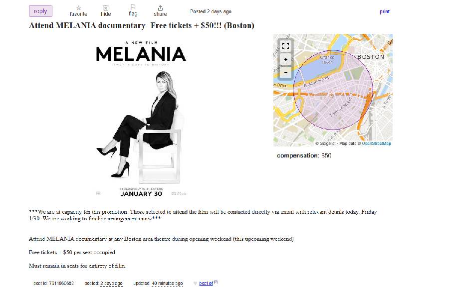 “We are at capacity for this promotion. Those selected to attend the film will be contacted directly via email with relevant details today, Friday 1/30. We are working to finalize arrangements now,” reads a note on the Craigslist website.