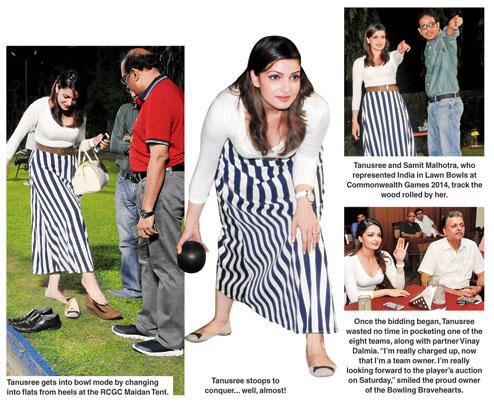 Tanusree even tried her right hand at bowling before raising it to bid for the team called Bowling Bravehearts. She changed into flats from heels and got rolling! Arming herself with a wood, she aimed at the jack and came quite close almost every time. “I’ve heard about Lawn Bowling from a number of my friends but this is the first time I tried it. I was taught very well (by Team India bowler Samit Malhotra) and they said I wasn’t too bad! I feel quite excited righted now,” laughed the Buno Haansh girl.