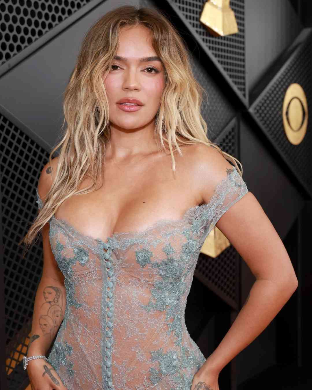 Colombian singer-songwriter Karol G, who is also known as La Bichota, made a dazzling appearance in a sheer, light blue corset gown from the Australian label Paolo Sebastian. It featured off-the-shoulder straps, a heart neckline, and a thigh-high slit.