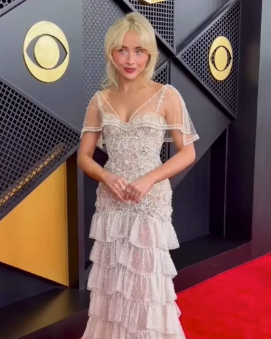 Grammy award-winning singer Sabrina Carpenter, who performed her chartbuster songs at the award show on Monday, looked classy in a white outfit, designed by Alessandro Michele. The outfit featured a heavily beaded and embroidered bodice, a sheer caplet, and a voluminous skirt made of tiered ruffles.