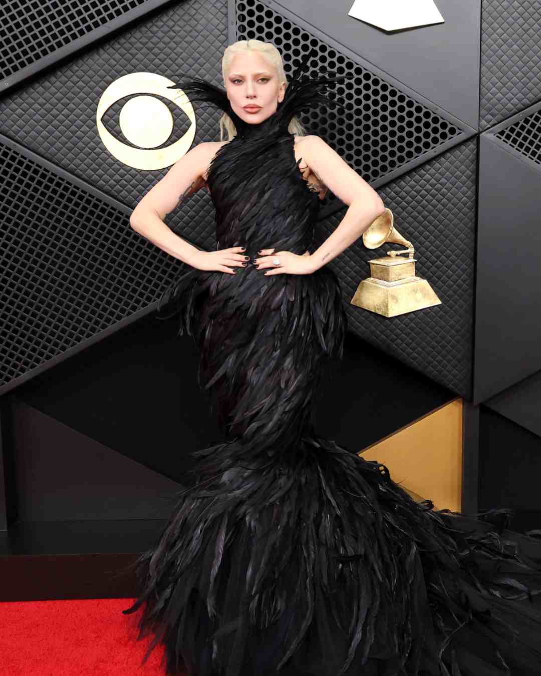 Singer-songwriter Lady Gaga wore a dramatic couture gown from Parisian brand Matières Fécales, which was covered from head to toe in raven-black feathers.